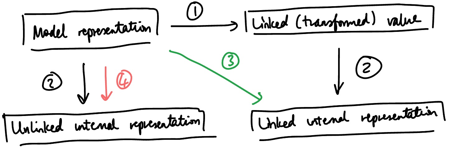 This arrow brings us from the model representation to the linked internal representation. This is the composition of (1) and (2): linking and then vectorising.